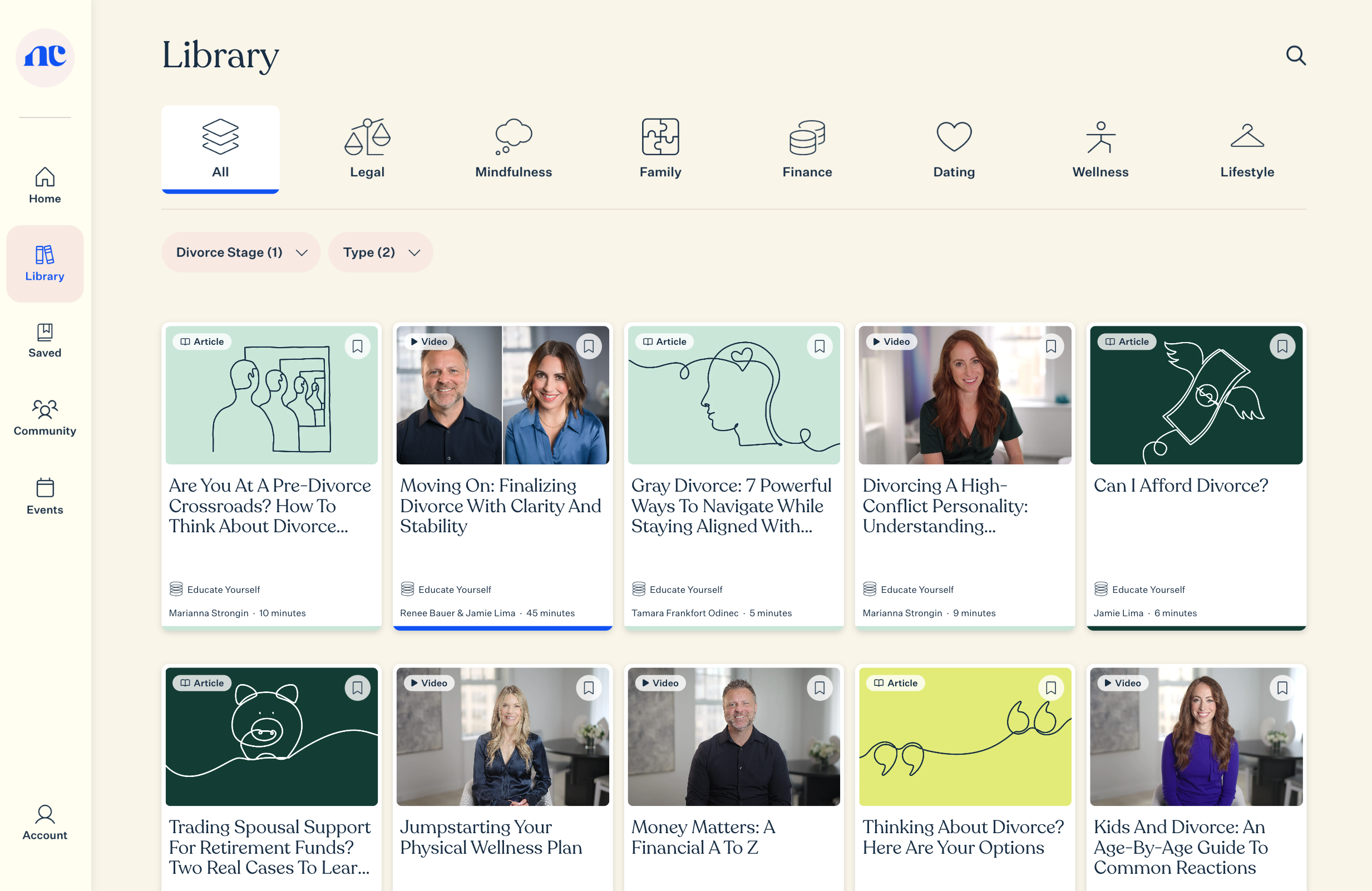 We offer videos, articles, small groups and live events led by subject matter experts with a focus on the legal process, financial planning, co-parenting, personal growth, and wellness.